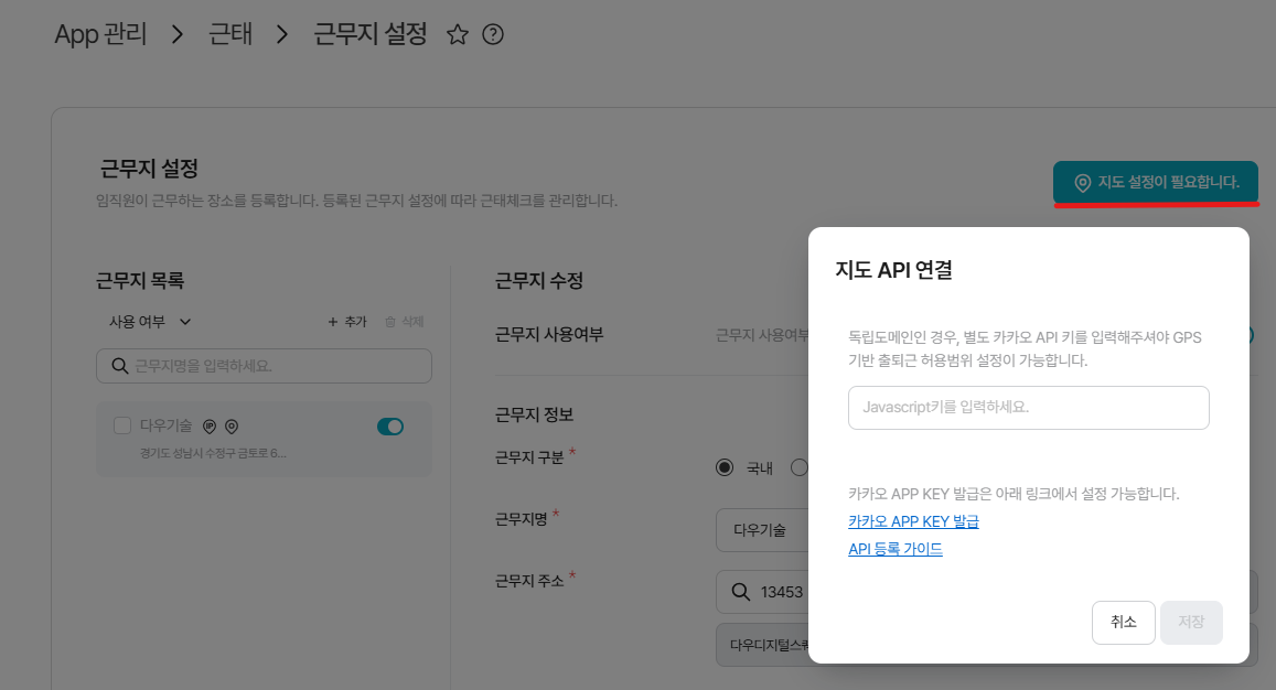 복사한 카카오맵 JavaScript 키 값을 🧭App관리 > 경영업무 포털 > 근태 > [근무지 설정]에서 [지도 설정이 필요합니다] 버튼을 클릭하여 입력후 저장합니다.