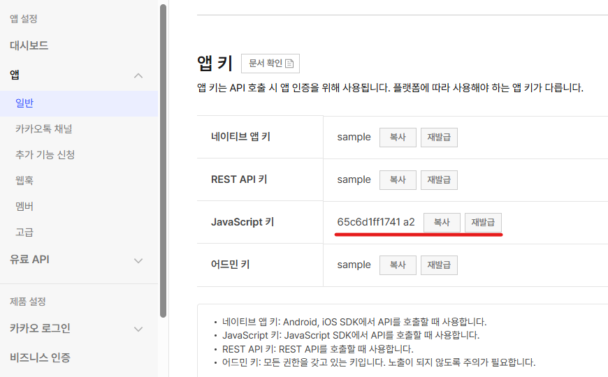 - 🧭 카카오 디벨로퍼 > 앱 > 일반 >JavaScript 키를 복사합니다.