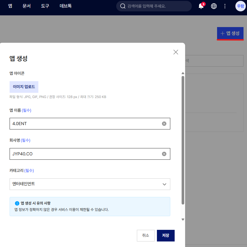 - 로그인 후, 메인 화면의 상단의 [앱] 선택 > [ ➕앱 생성] 클릭하여 애플리케이션 정보를 입력, 저장