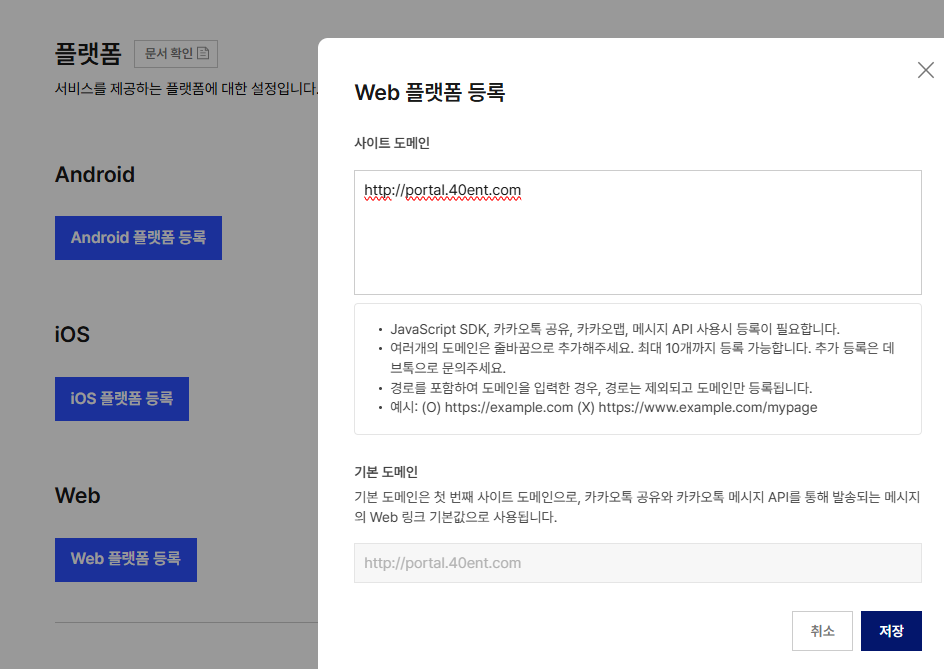 - 카카오맵 접속 허용을 위해 아래로 스크롤하여 플랫폼 - [Web 플랫폼 등록]을 클릭하여 그룹웨어 접속 주소를 입력합니다.