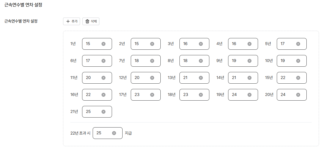 근속연도별 연차 설정
