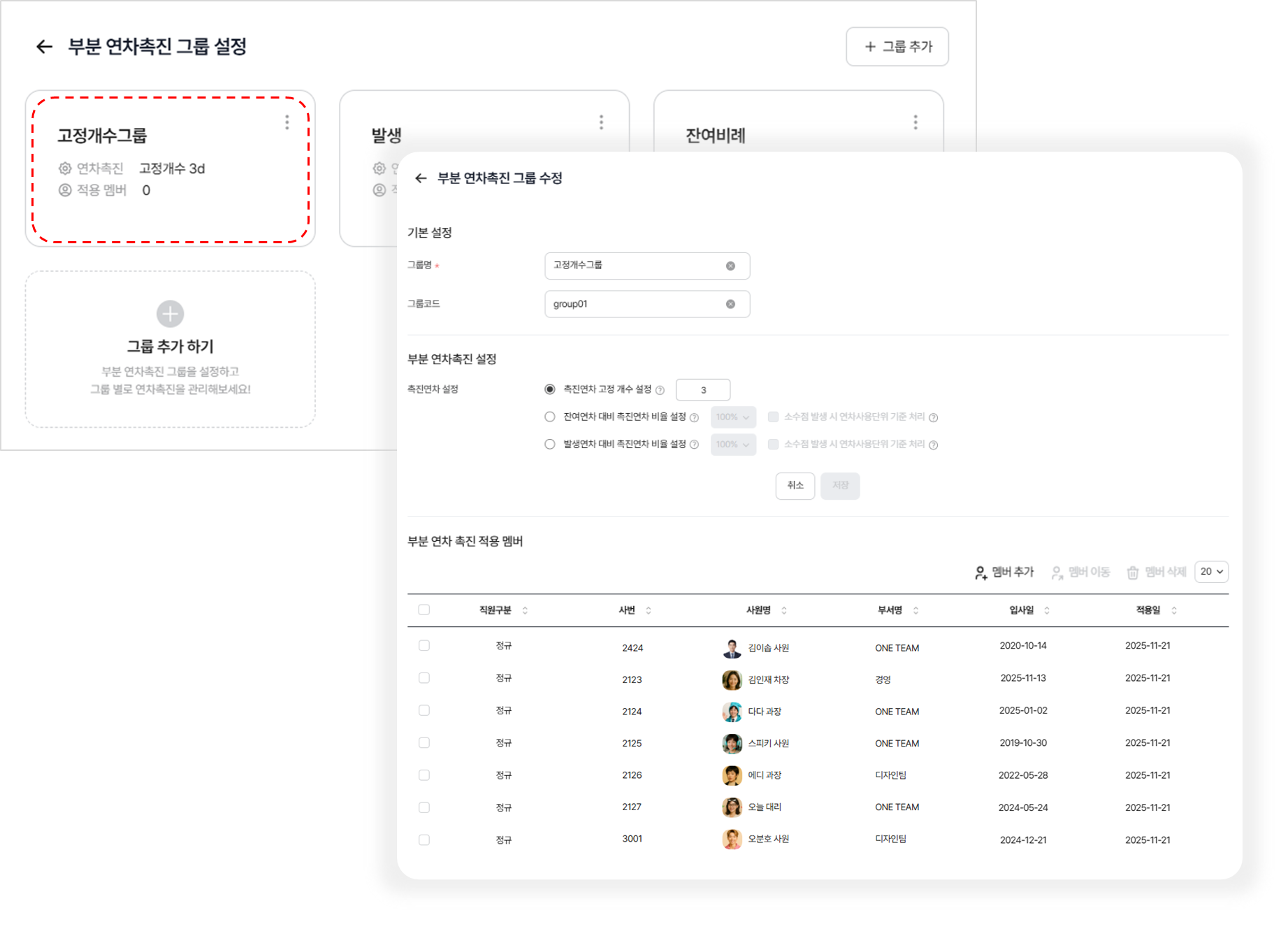 부분연차 촉진 그룹에서는 해당 그룹에 적용될 직원(멤버)을 추가·이동·삭제하고, 그룹의 기본 설정을 수정하거나 삭제할 수 있습니다.