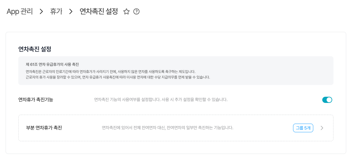 - 부분 연차촉진으로 추가된 그룹이 존재하는 경우 OFF는 불가합니다. 그룹 미설정 또는 삭제 후 OFF 가능합니다.