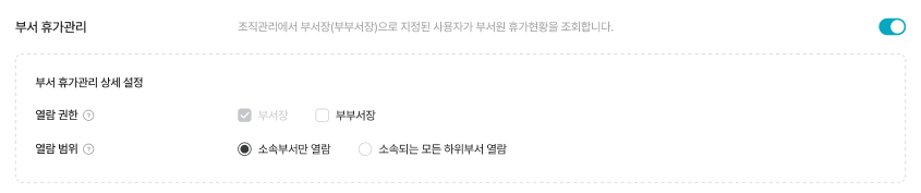 - 부서장(부부서장)이 부서원 휴가 현황을 조회할 수 있도록 열람 권한 및 범위 설정 가능