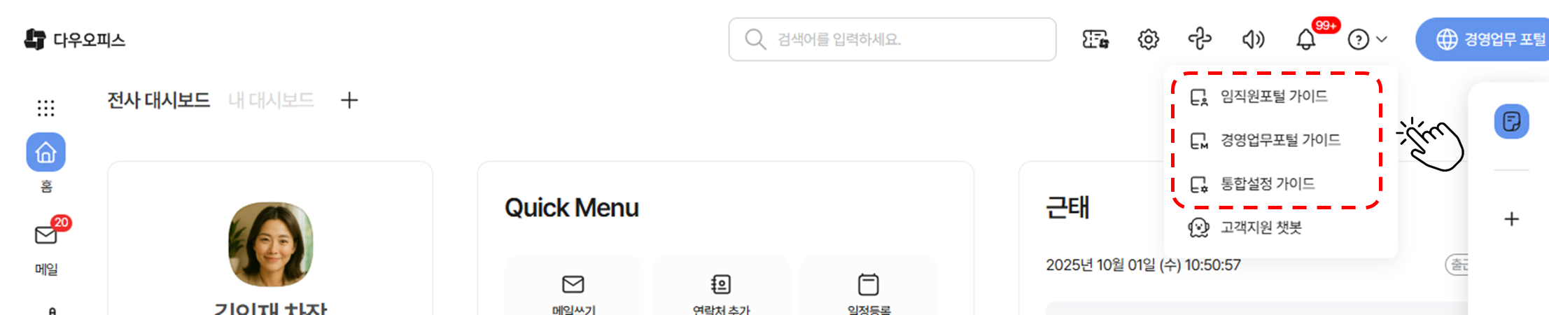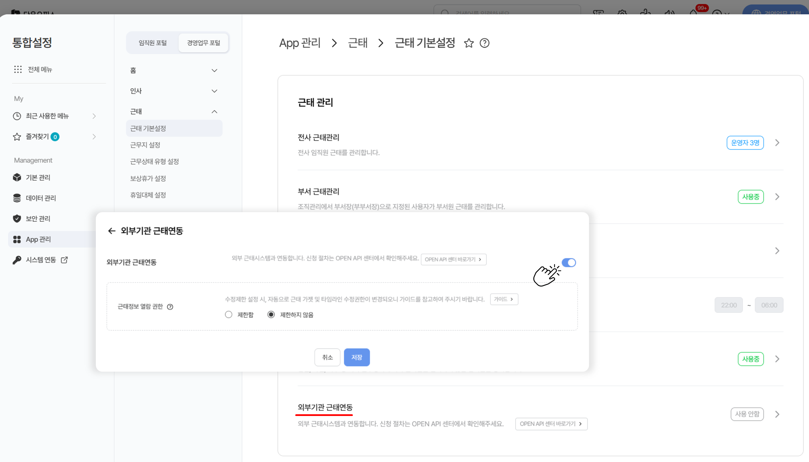 - 🧭 통합설정⚙️ > App 관리 > 경영업무 포털 > 근태 > 근태 기본설정에서 [외부기관 근태연동]을 [ON] 설정