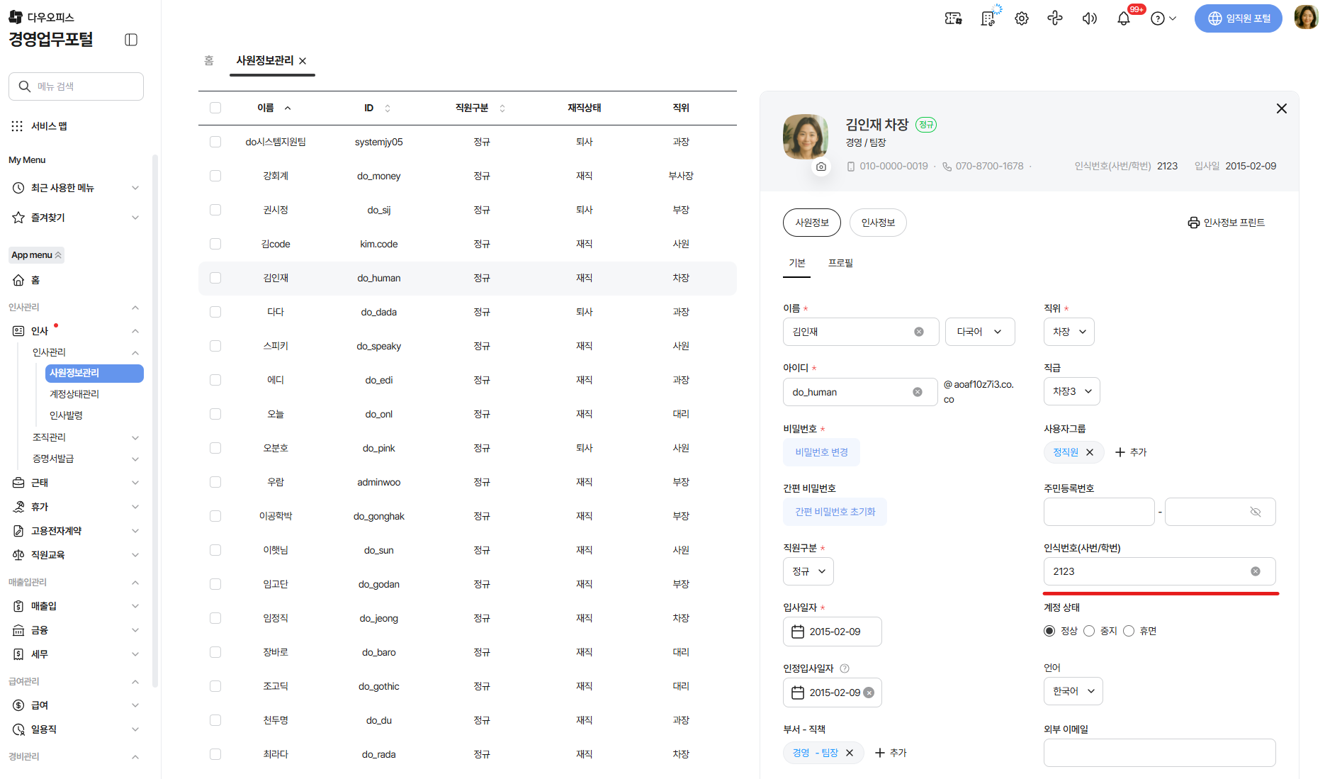 - [사원정보]에서 보안사 사원번호 = 다우오피스 인식번호 동일하게 등록