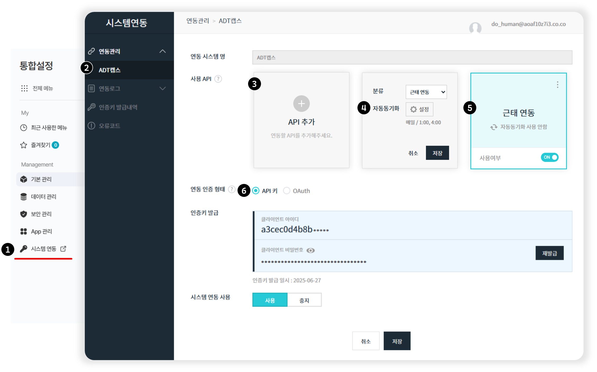 4️⃣ [통합설정] 시스템연동 설정 → API 추가, 동기화 주기 및 인증키 발급