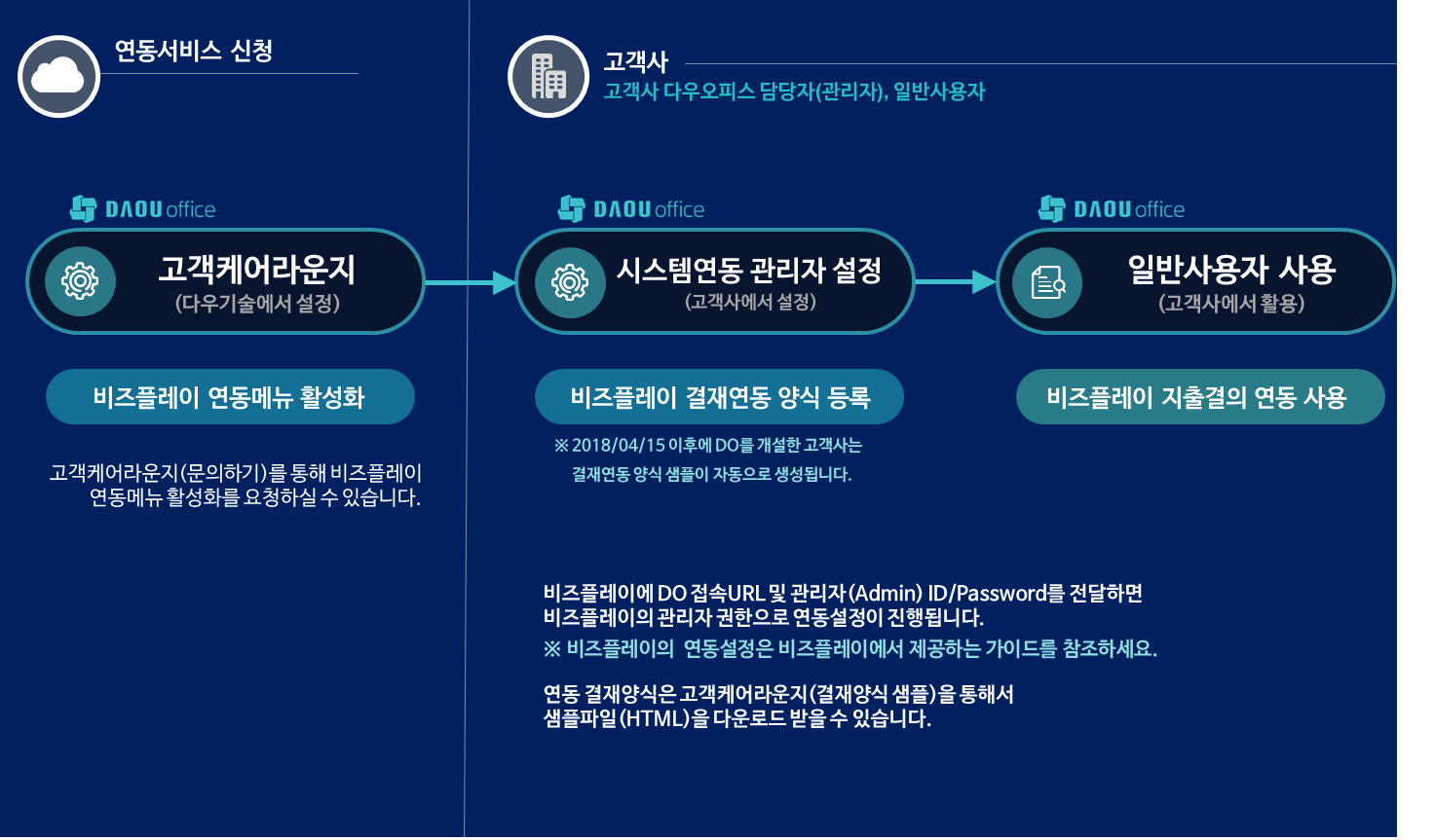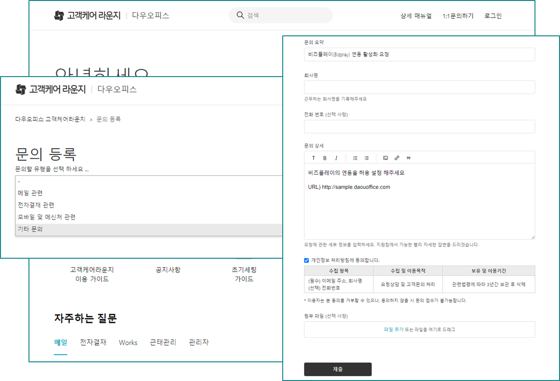 다우오피스와 비즈플레이 연동을 위해서는 먼저 고객케어라운지 문의등록을 통해 연동허용을 요청하여 활성화해야 합니다.