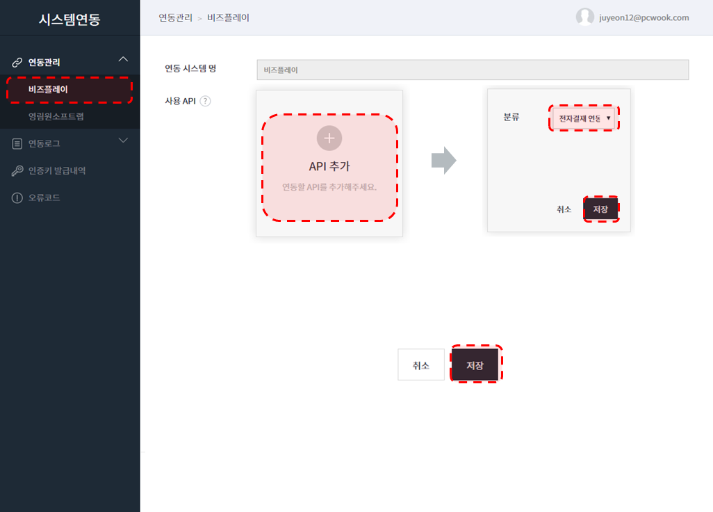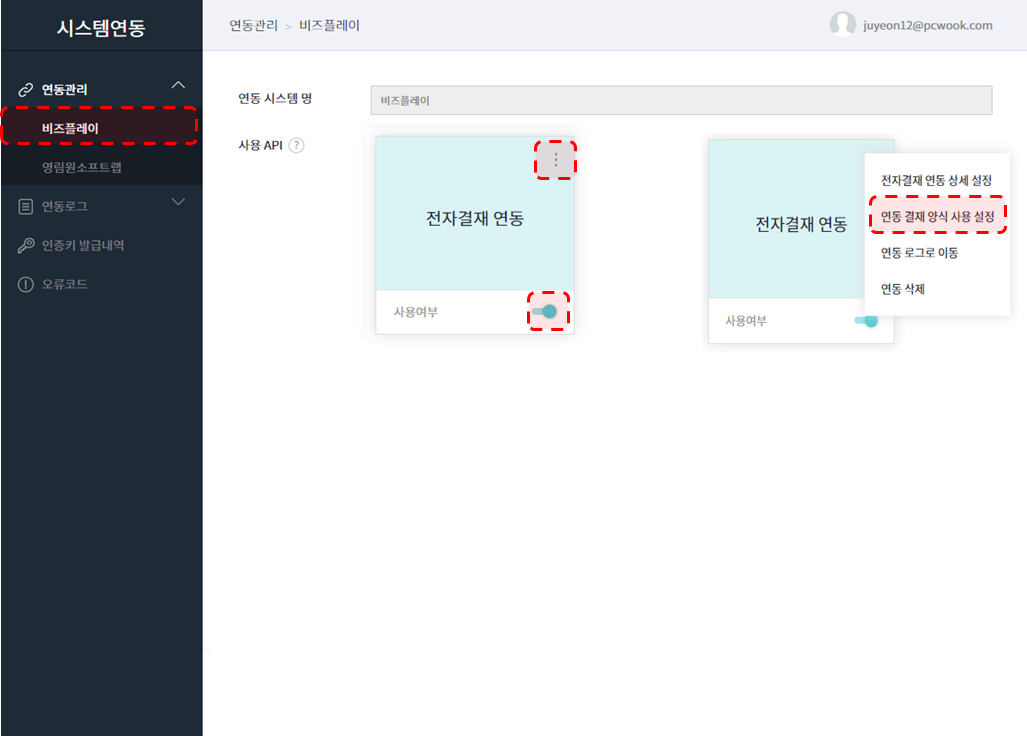 비즈플레이 연동을 위해 시스템연동 관리자 권한의 사용자로 로그인 하고,