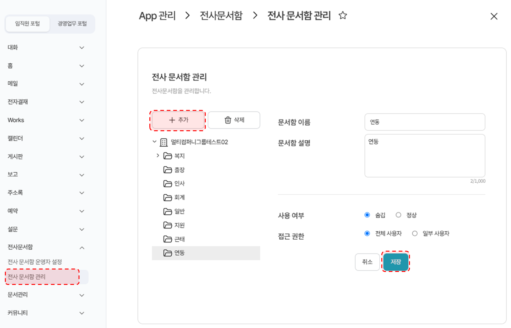 3. '연동' 문서함 생성하여 [저장] 클릭 (사용여부 : 숨김, 접근 권한 : 전체 사용자로 설정)