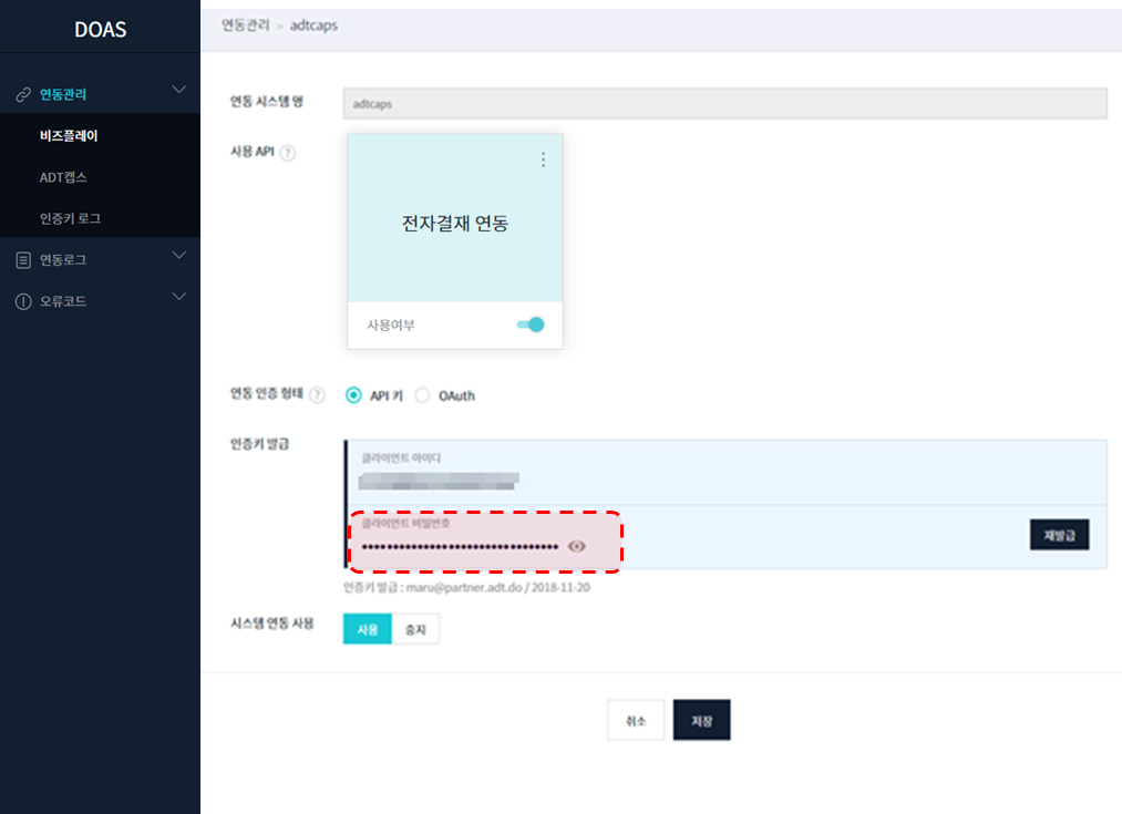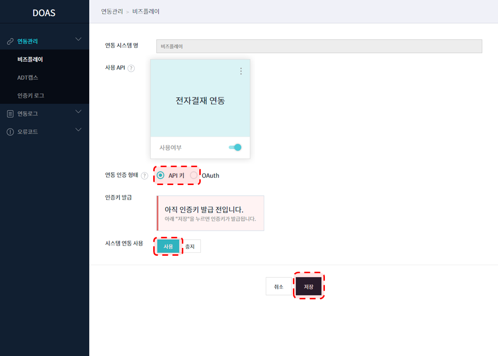 3. [저장] 클릭시 연동 인증키가 발급 됨