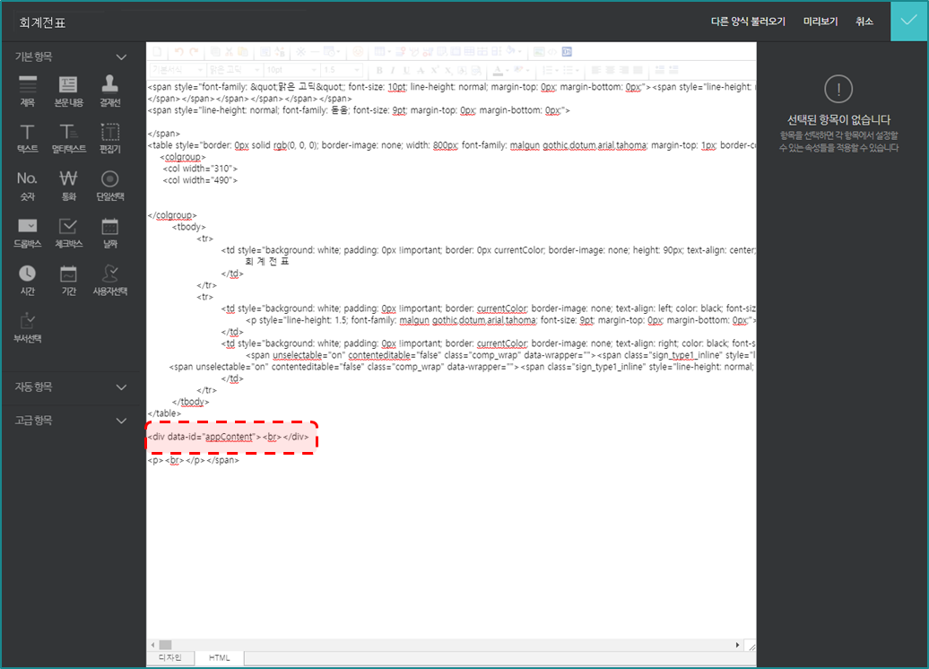 - 결재연동 본문이 DIV DATA-"appCotent"에 자동으로 본문이 치환되어 등록됩니다.