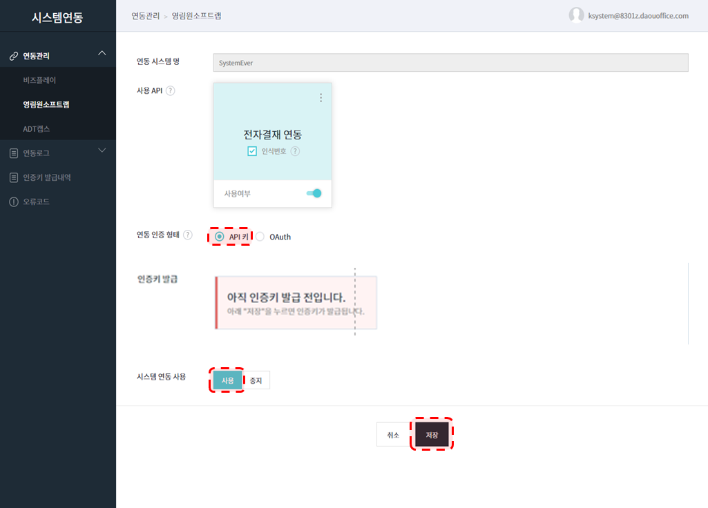 4️⃣시스템 연동 사용을 설정후 저장합니다.