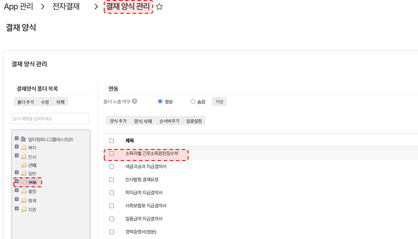 1️⃣🧭통합설정 > App 관리 > 전가결재 > [결재양식관리]의 [연동]폴더에서 추가한 결재 양식 확인 및 선택합니다.