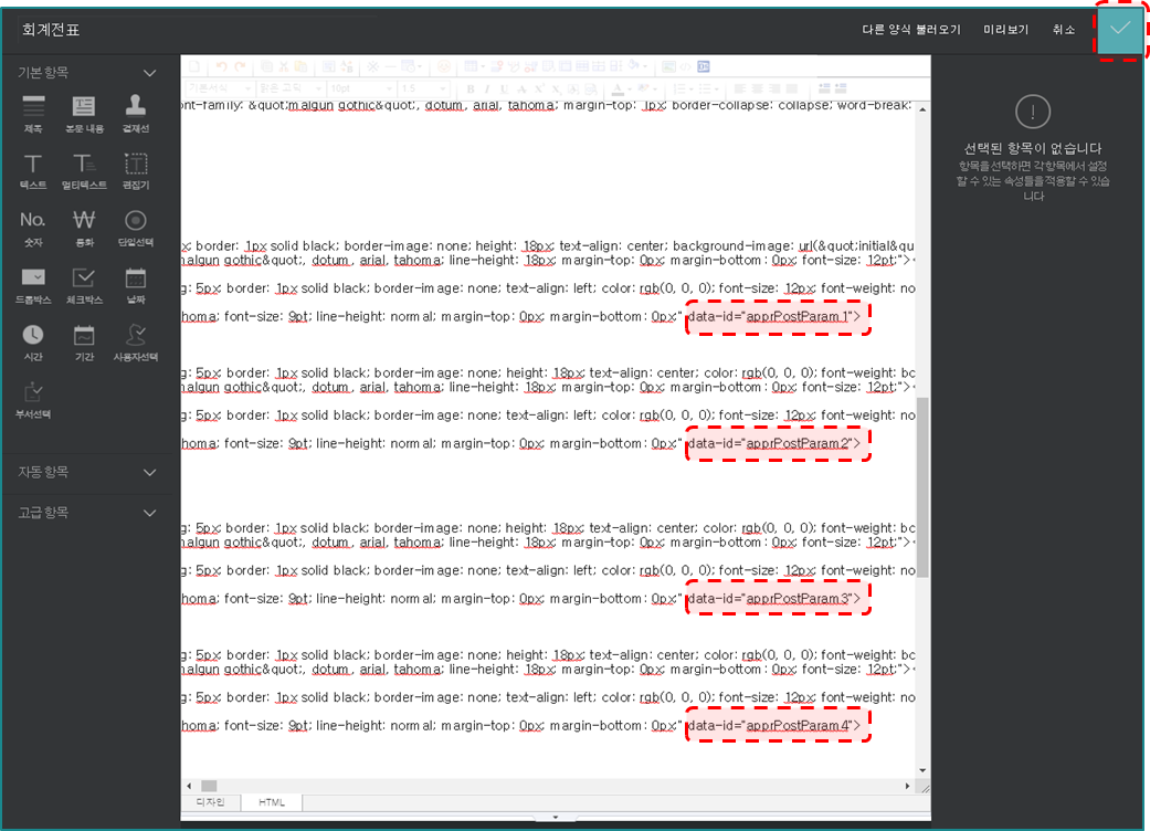 5️⃣HTML편집 본문에서 아래부분에 필드연동 태그값 <DIV DATA-id=“appPostParam{n}”> 을 추가후 저장 아이콘[✔️]을 클릭합니다.