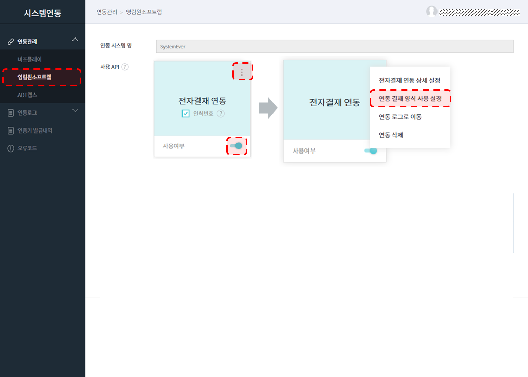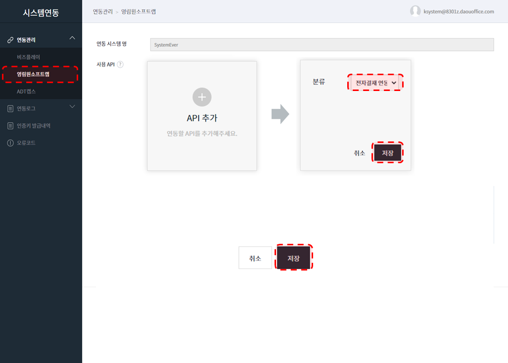 영림원소프트랩(SystemEver) ERP연동을 위해 시스템연동 관리자 권한의 사용자로 로그인 하고,