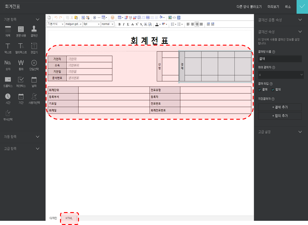 2. 제목 및 결재방 등을 등록하여 양식 디자인을 진행한 후 양식편집기 하단 [HTML] 클릭