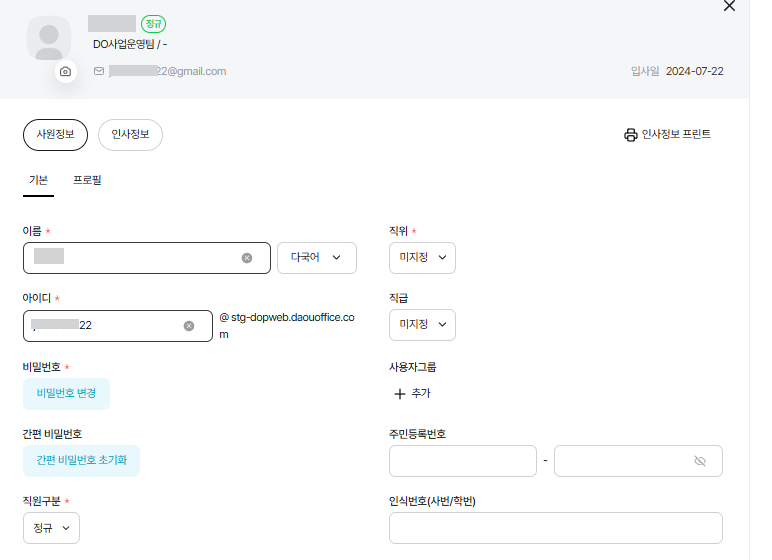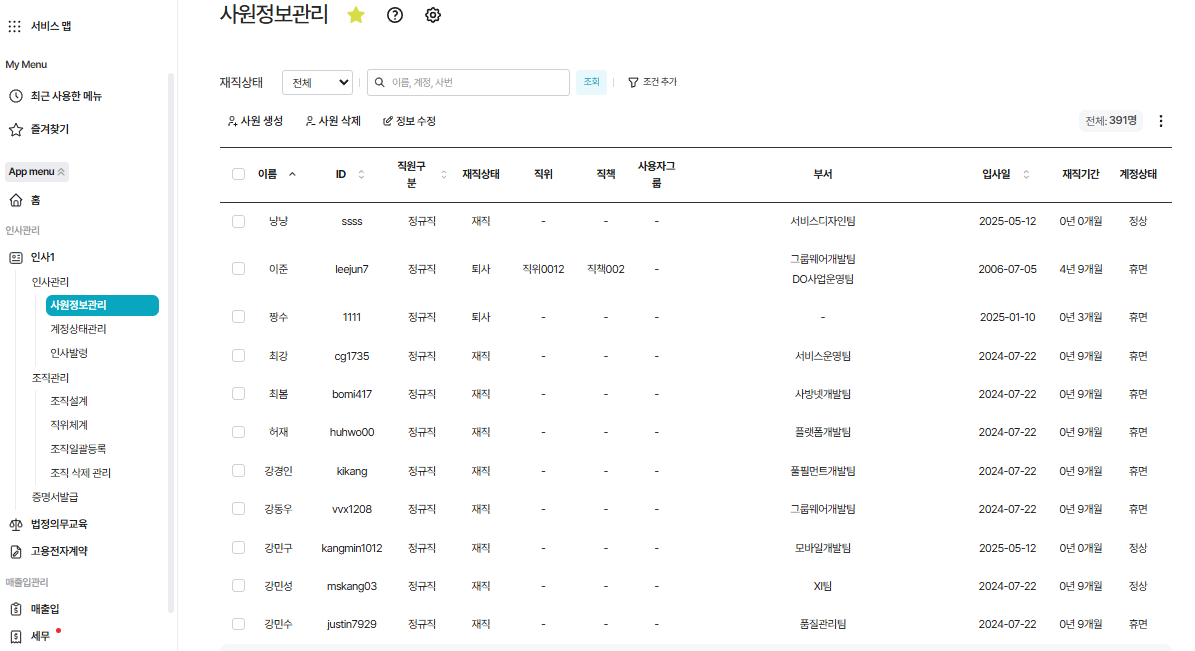 1️⃣🧭경영업무포털 > 인사 > 인사관리 > [사원정보관리]에서 영림원소프트랩 연동 대상 사용자를 선택합니다.