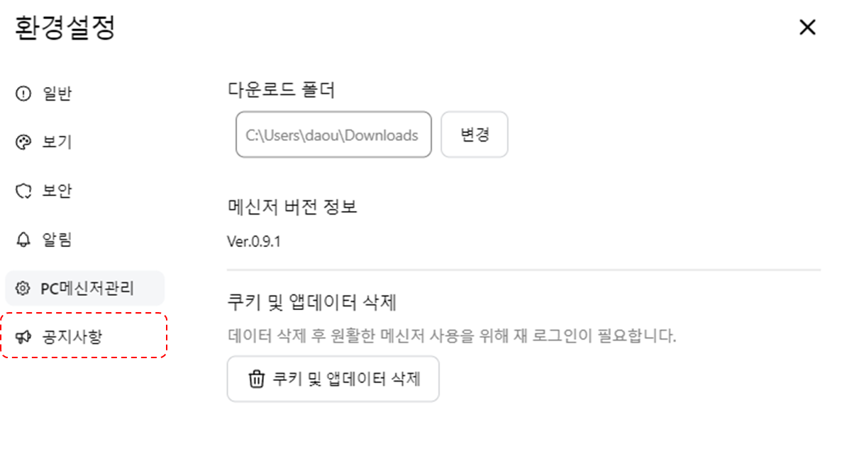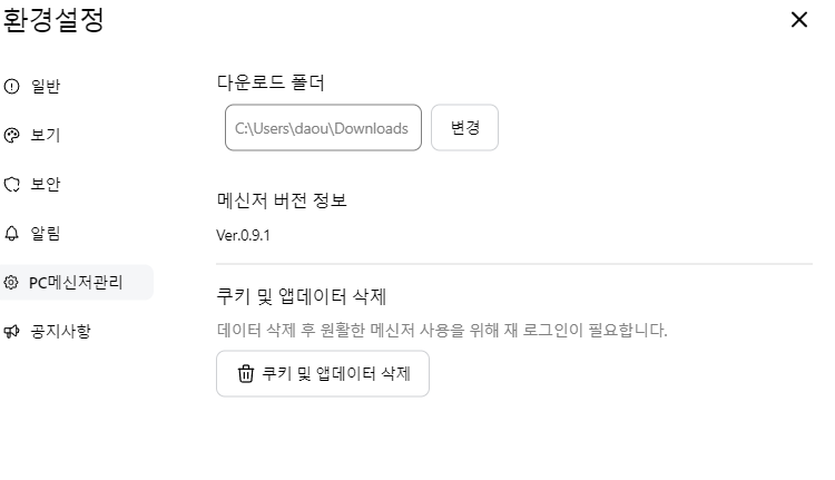 메신저로 받은 첨부파일을 저장할 경로를 지정하고, 원활한 메신저 사용을 위해 불필요한 쿠키 및 앱 데이터를 정리할 수 있습니다.
