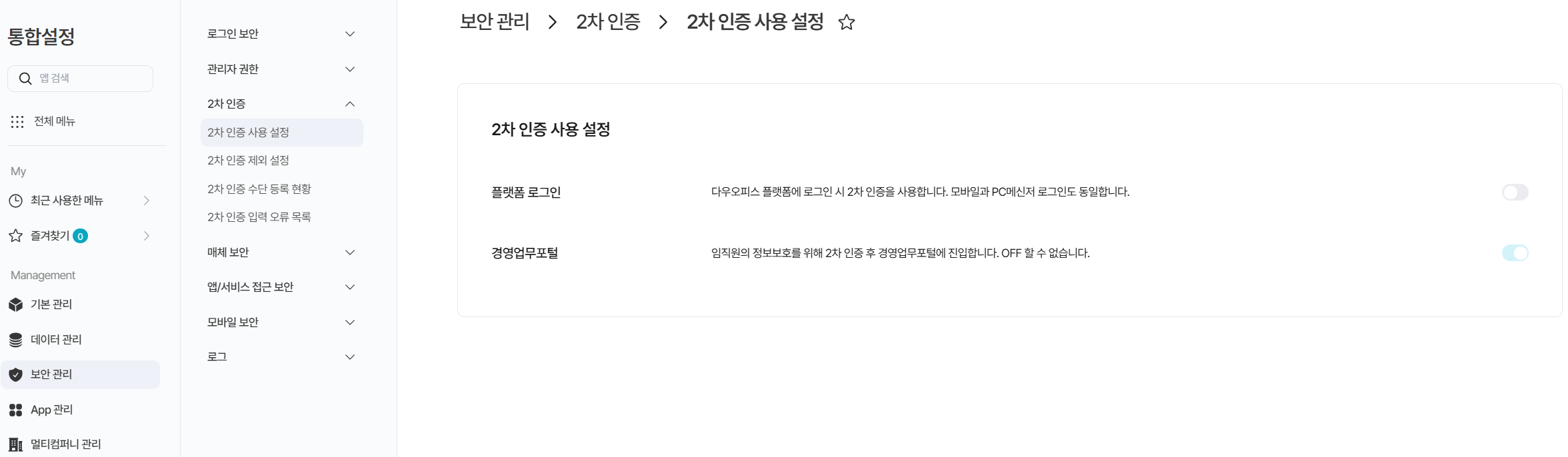 2차 인증 관리 : [바로가기]클릭 시 다우오피스 🧭통합설정⚙️ > 보안관리 > 2차 인증 설정 및 관리 > [보안]설정 화면으로 바로 이동