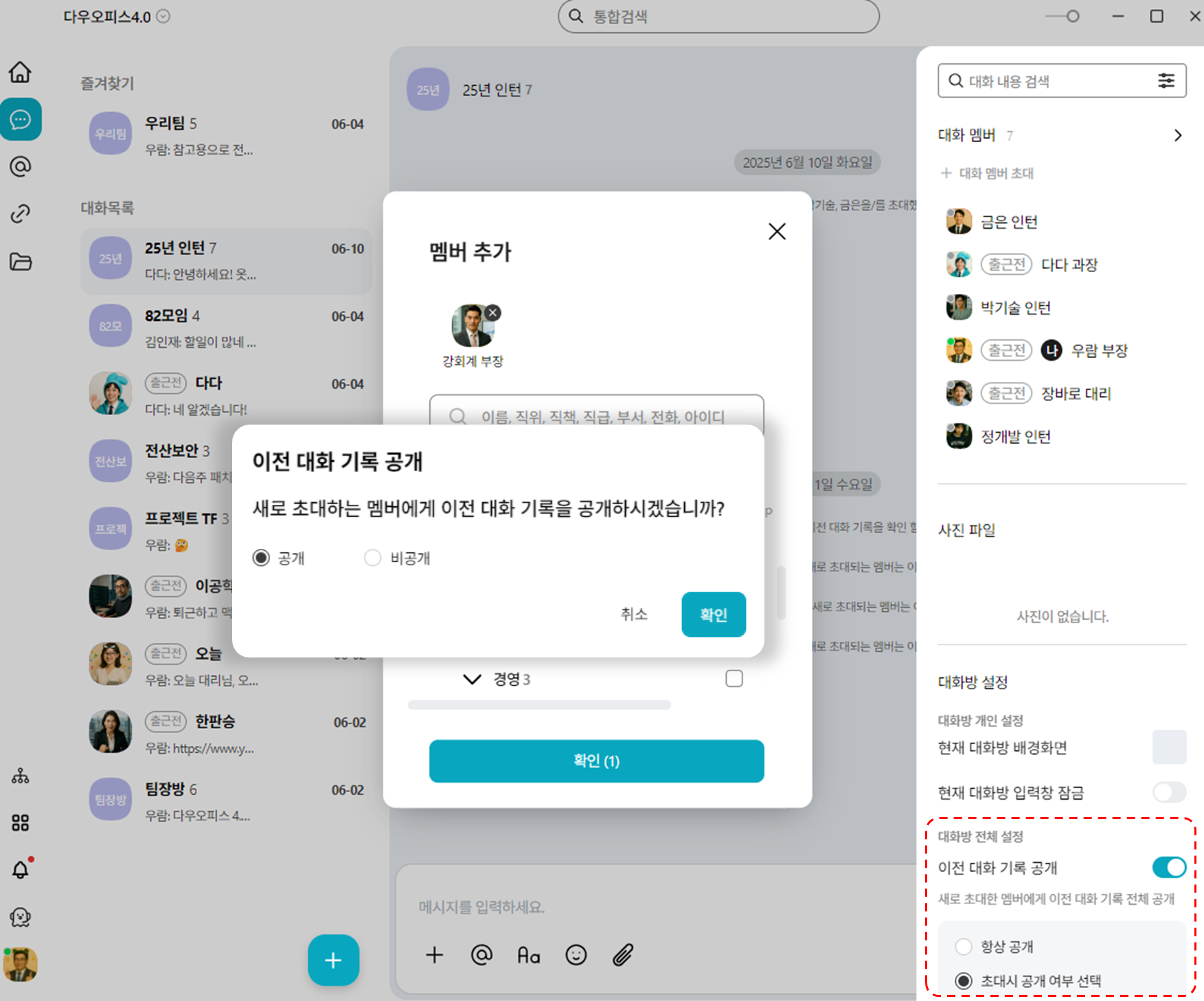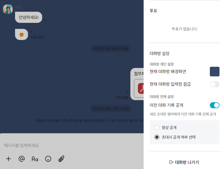그룹 대화방에 새 멤버를 초대할 때, 기존 대화 내용을 공개할지 여부를 설정할 수 있습니다. 이전 대화 기록 공개 옵션이 ON일 경우, 아래 두 가지 방식 중 하나를 선택할 수 있습니다.- 항상 공개 : 멤버를 초대할 때마다 자동으로 이전 대화 기록이 공개