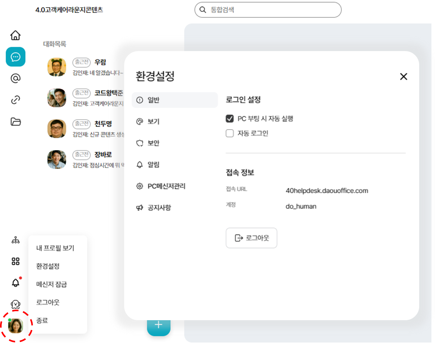 🧾일반설정 : 🧭 PC메신저 > 왼쪽 하단 프로필 > 환경설정 > [일반]