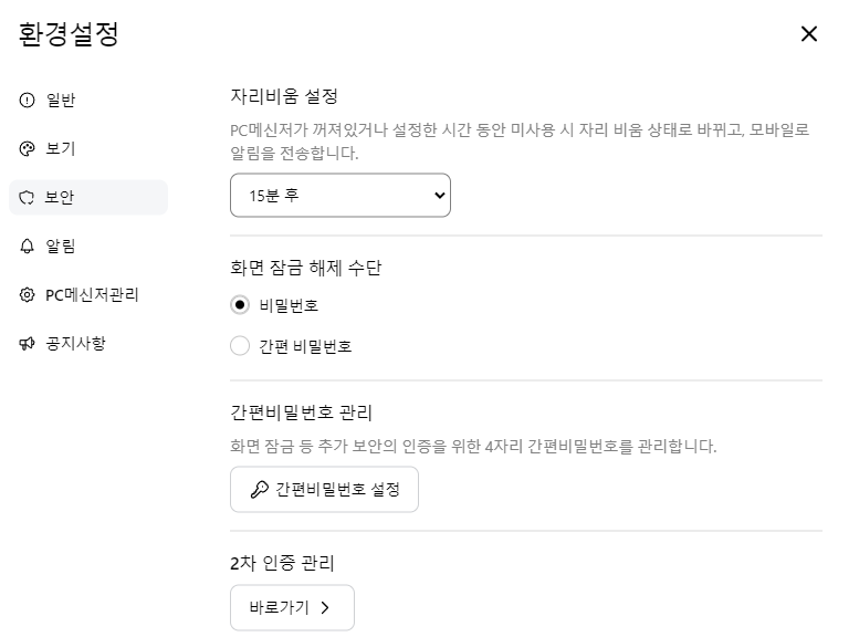 설정위치 : 🧭 PC메신저 > 왼쪽 하단 설정(프로필) 클릭 > 환경설정 > 보안