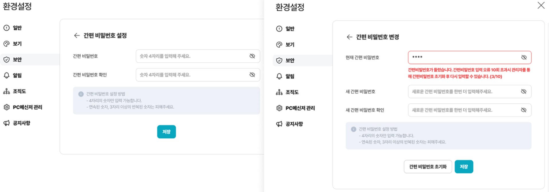 간편비밀번호 관리 : 화면 잠금 해제 수단 중 간편 비밀번호를 선택했을 경우에 사용할 간편비밀번호 설정, 설정 이후 언제든 변경 가능