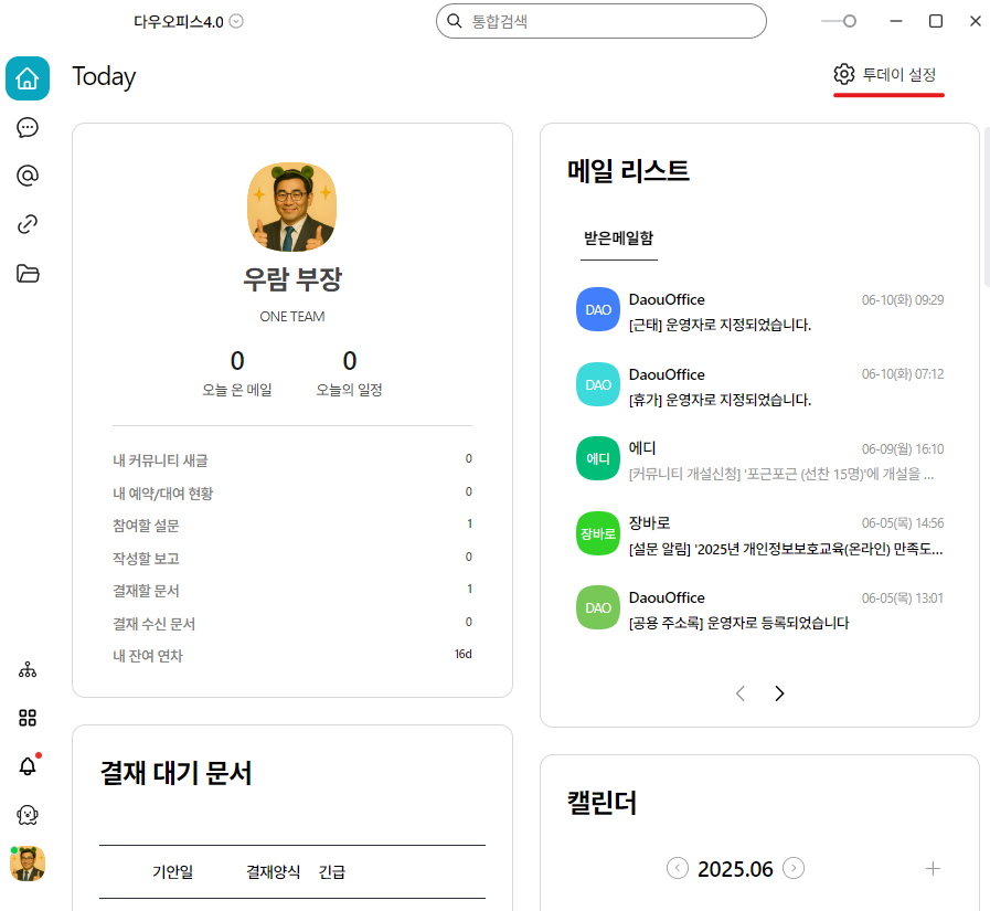 - 설정 위치 : 🧭PC 메신저 > 홈 화면 > [투데이 설정⚙️]