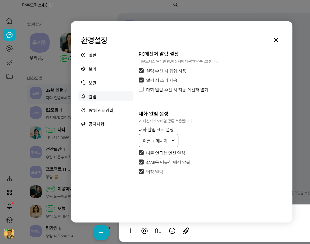 메신저 알림 방식과 세부 설정을 직접 조정하여 필요한 알림만 효율적으로 받을 수 있습니다.