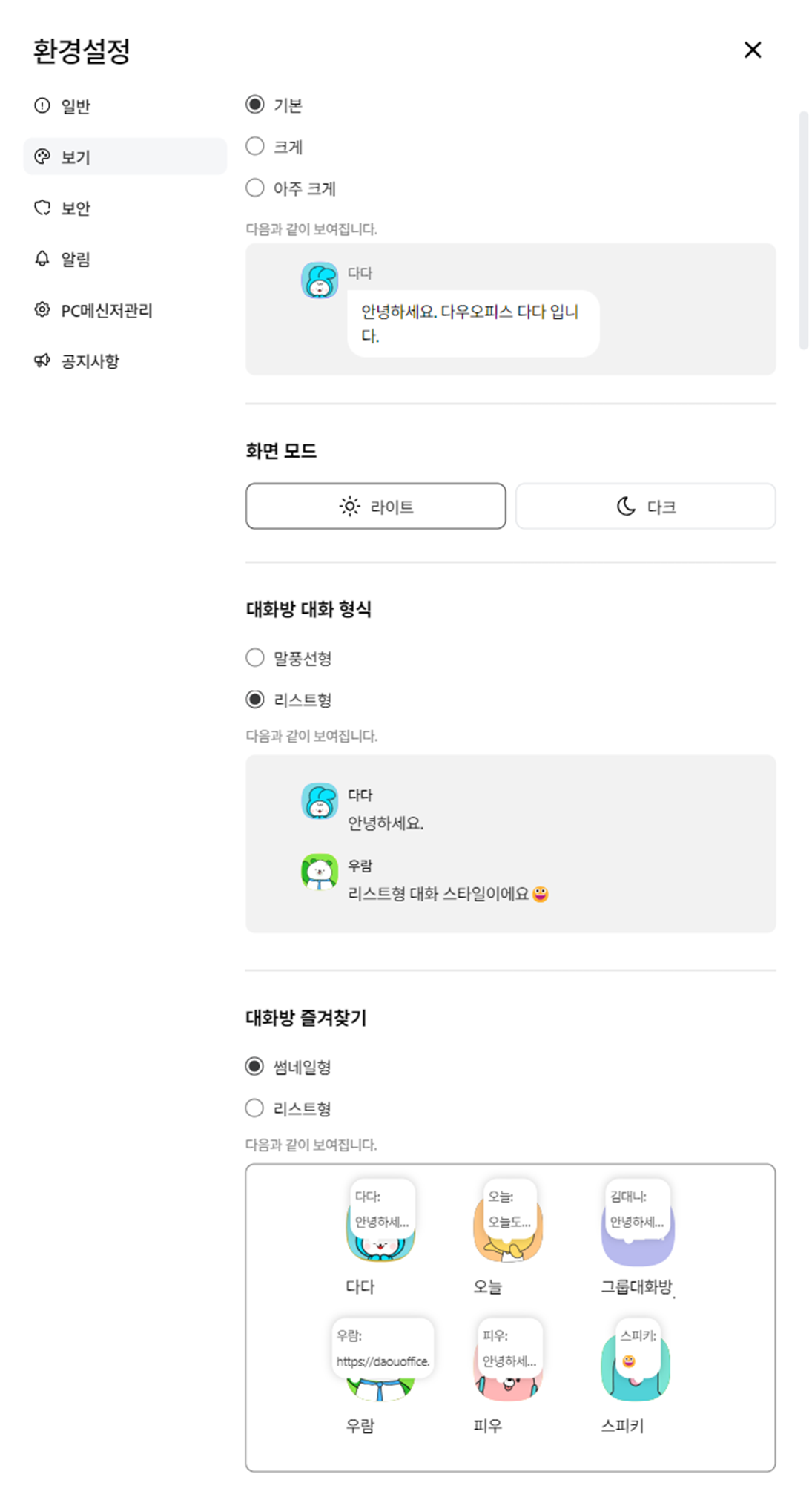 - 대화방 즐겨찾기 : 대화방 목록 상단 즐겨찾기 형식을 썸네일형/리스트형 선택