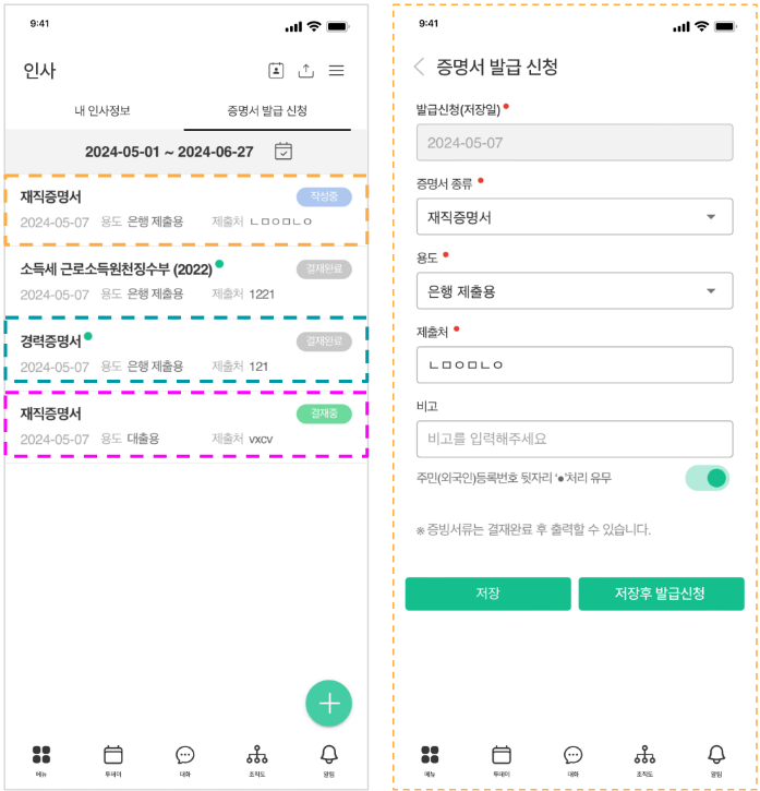 - [저장] 터치하여 추가 입력 혹은 [저장 후 결재요청] 터치하여 결재 상신