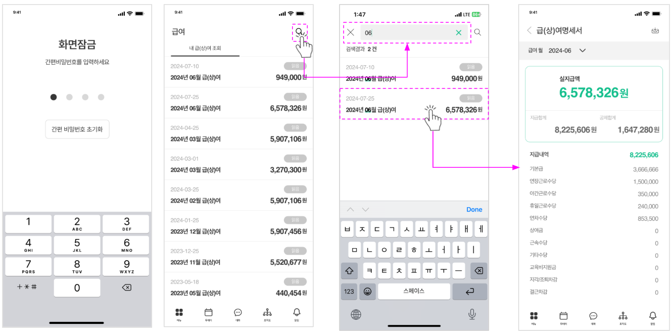 나의 급(상)여 목록 및 명세서를 확인할 수 있습니다.
