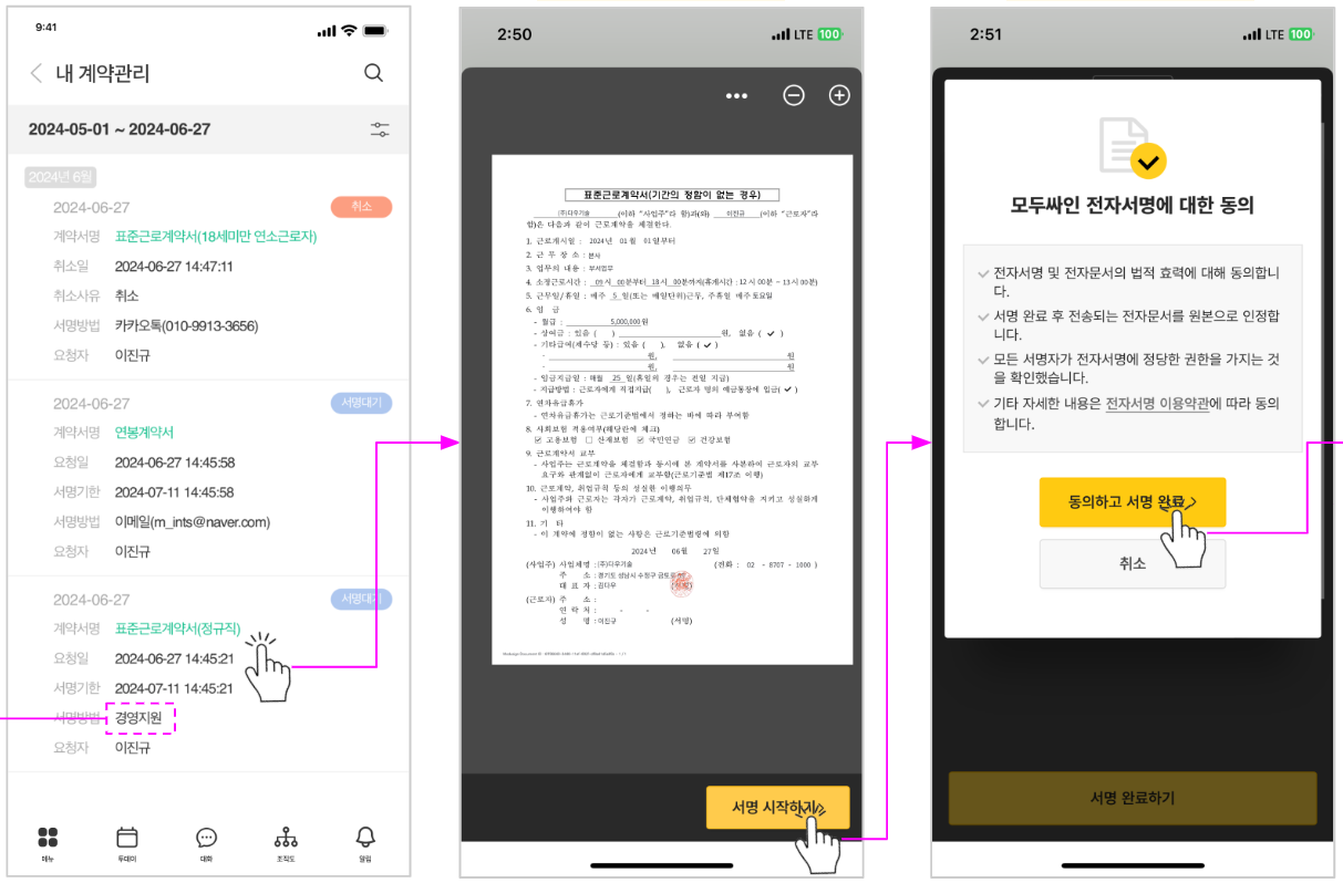 고용전자계약 서비스를 사용중인 회사의 경우, 모바일 앱에서 회사와 체결한 계약 현황을 조회하고 확인할 수 있으며, 서명대기 상태에 있는 계약서명을 클릭하여 내용을 확인하고 서명을 진행할 수 있습니다.
