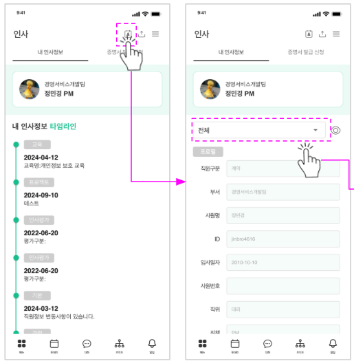 - [내 인사 정보] 탭에서 나의 인사 정보 및 정보 변경 타임라인 확인 가능