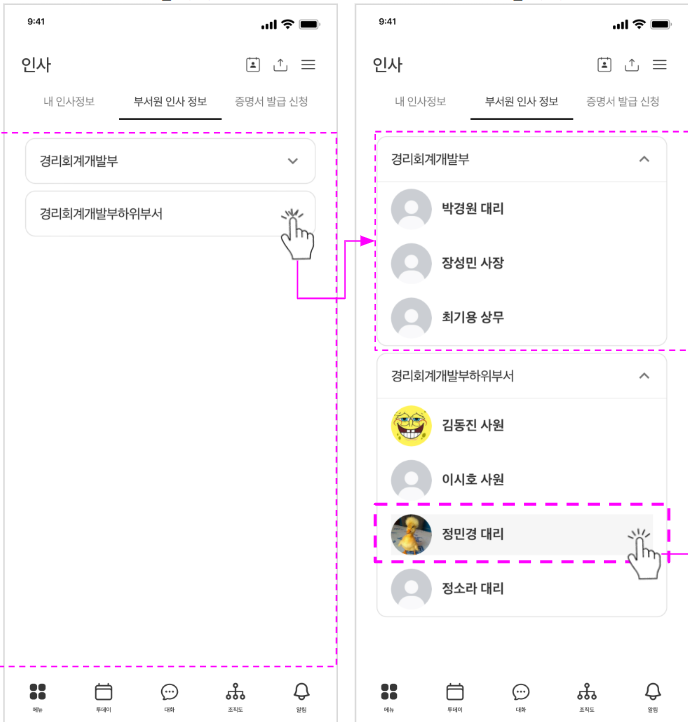 - [부서원 인사 정보] 탭 터치