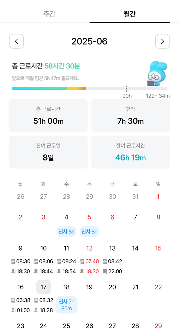예 ) 선택근로제도 사용중인 회사의 경우, 현재까지의 근로시간과 잔여 근로시간을 계산하여