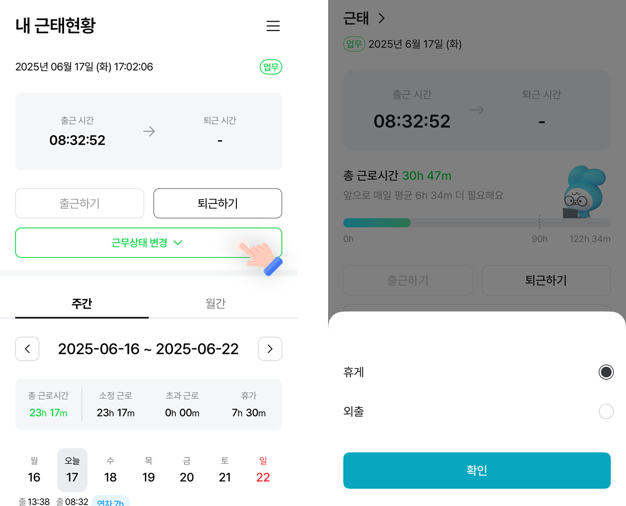 또는 메인 화면 근태 가젯 터치 - 출근하기/퇴근하기/근무상태 변경 터치하여 근태 체크