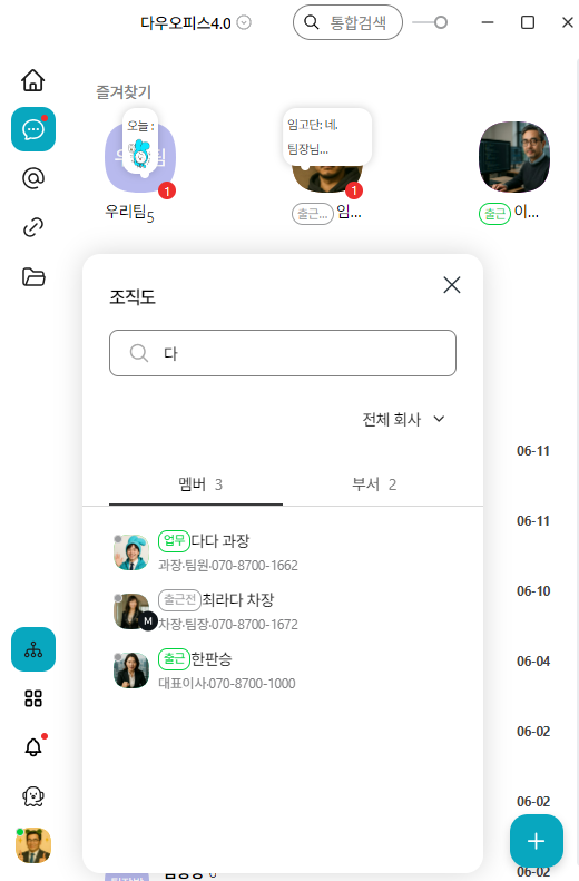 웹 포털 조직도와 동일한 구조를 기반으로 하되, 메신저 환경에 맞춘 직관적인 UI/UX를 제공합니다.