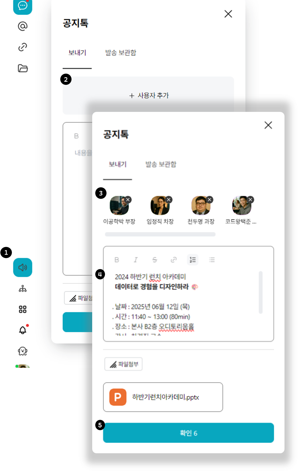 공지톡 발송 - PC메신저 전용 기능이며, 지정된 공지톡 운영자만 발송 가능합니다. (최고관리자도 불가)