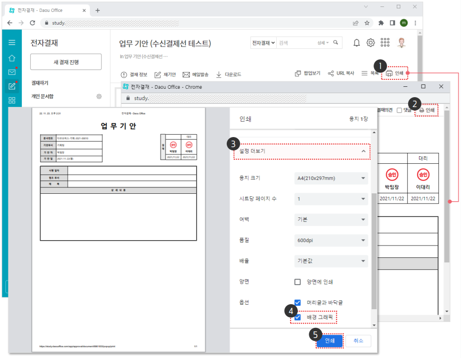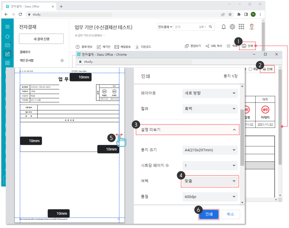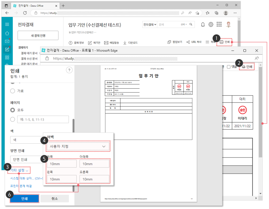 전자결재 문서를 출력해 저장하려면 웹페이지 인쇄 설정이 필요합니다.