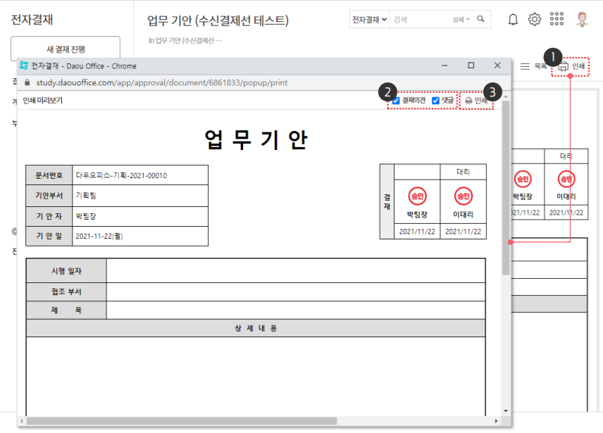 결재문서 인쇄시 결재의견과 댓글을 문서 하단에 출력하기 위한 방법을 확인해 보겠습니다.