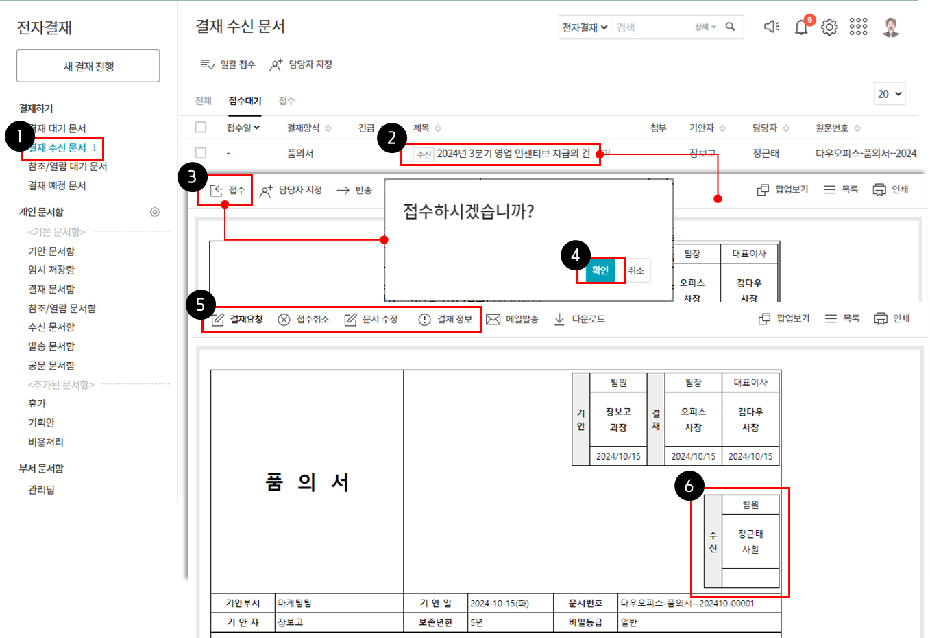 - 전자결재 > 결재 수신 문서 클릭