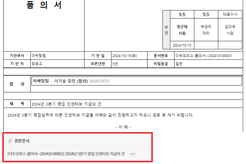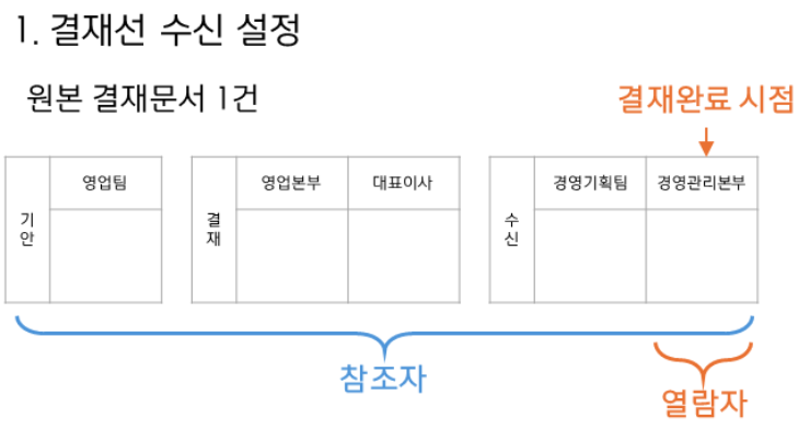 | 내용 | 결재선 자체에 수신 단계를 추가하여 하나의 결재 문서로 진행하는 방법 |