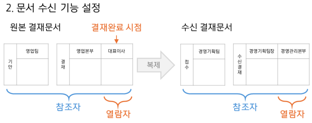 | 구분 | 1️⃣결재선 수신 설정 | 2️⃣문서 수신 기능 설정 |