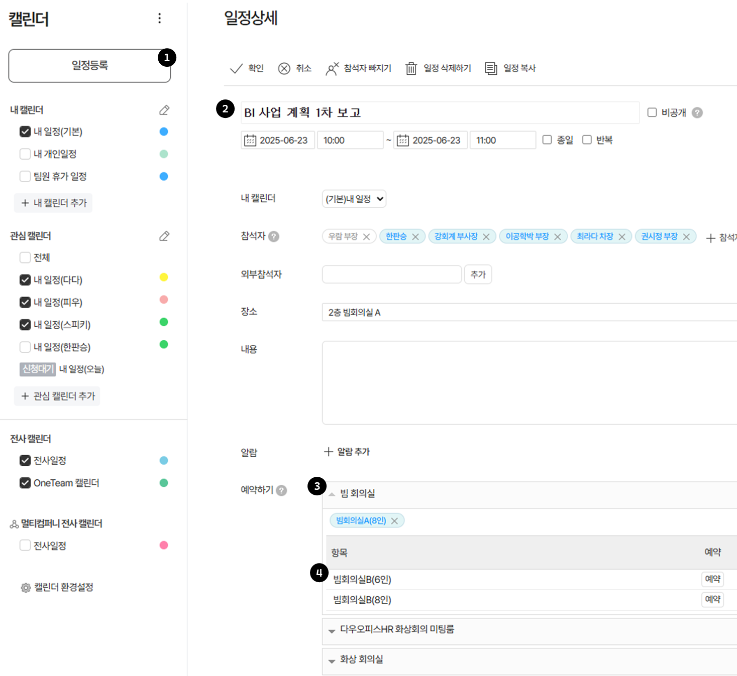 캘린더에 일정을 등록할 때, 등록할 일정 기준 예약할 수 있는 회사의 자산 (회의실, 장비 등)을 함께 선택하여 간편하게 예약할 수 있습니다.