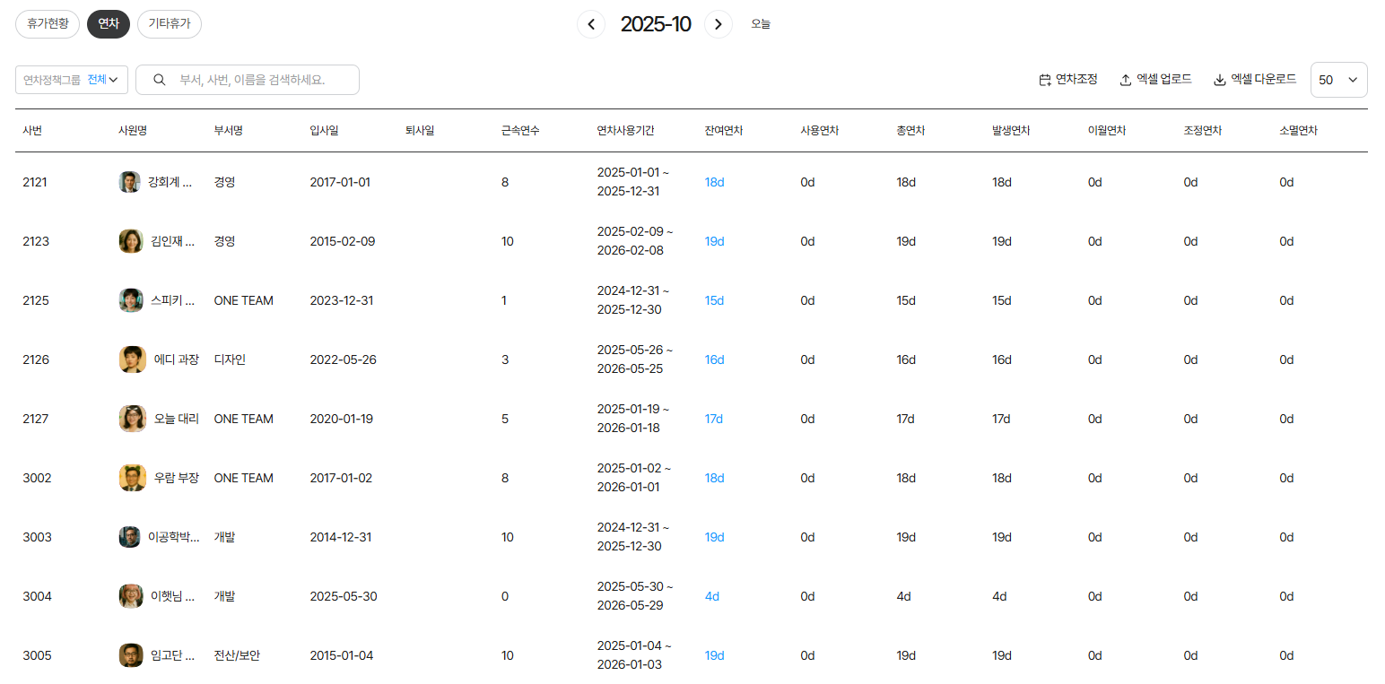 ✔️ 전사 연차에서 운영자는 연차조정 및 일괄 엑셀 업로드로 운영 가능