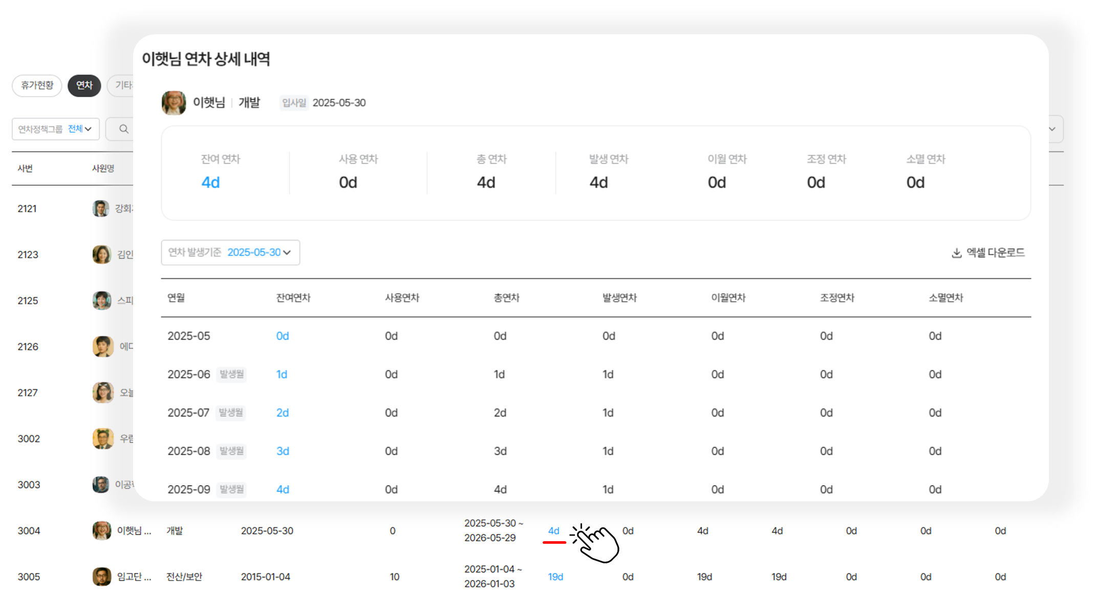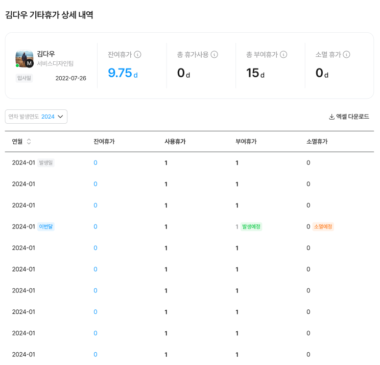 - 엑셀 다운로드 : 조회한 연차 내역을 엑셀 파일로 다운로드 가능
