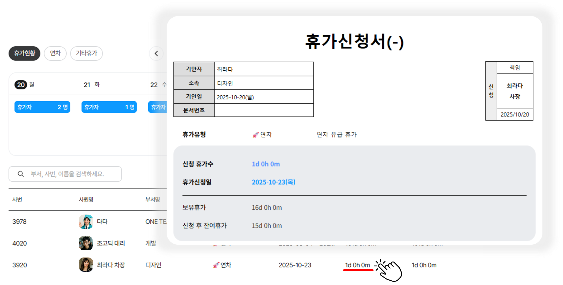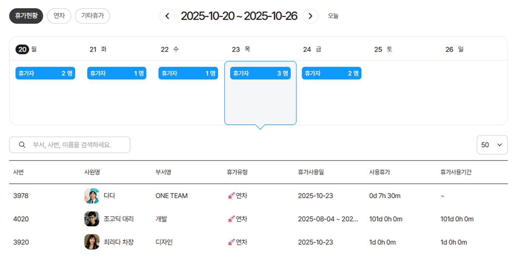 - [부서] 일별 휴가자 총 인원 및 개별 휴가자& 휴가 사용 시간 확인