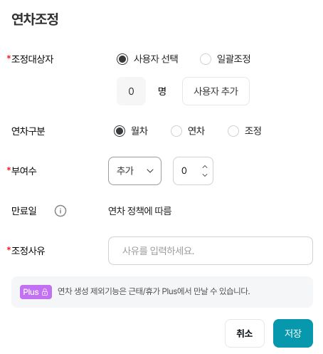 - 선택한 대상자에게 월차, 연차, 조정을 기준으로 휴가를 추가 또는 차감 가능